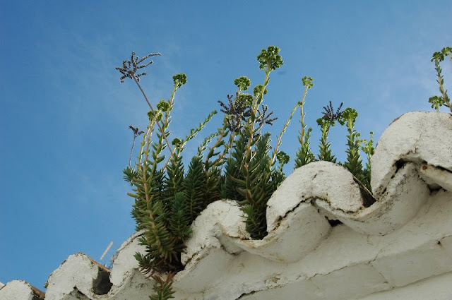 Sedum sediforme creciendo en un tejado y con las inflorescencias a punto de abrir.