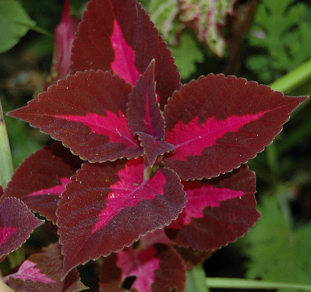 Solenostemon hybrido,coleo.Me encantan los coleos y todos los años dan las notas de color al jardín.No todos aguantan el invierno y las orugas de las polillas nocturnas depositan sus huevos en sus tiernas hojas y en pocos días si te descuidas los dejan pelados.Los suelo fumigar con agua de tabaco(Se dejan en remojo algunas colillas de cigarros) el olor las repele pero solo un tiempo.Este ha aguantado el invierno y se vuelve a poner bonito.