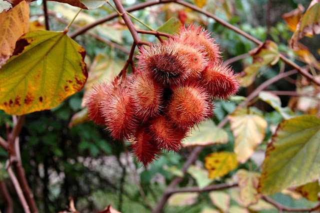 Bixa orellana ,originaria de América Tropical pertenece a la familia de las bixáceas.Muy utilizada como condimento y colorante que se saca de sus semillas de un color rojizo amarillento.