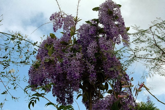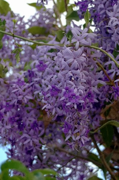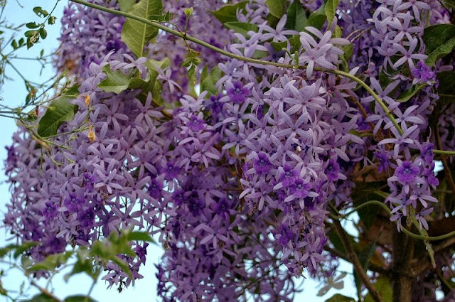 Petrea volubilis ,está espectacular con tantas flores.No es mía en realidad es del jardín de mis vecinos pero florece hacia mi muro y la disfruto como si fuera mía.Como ellos riegan poco tiene pocas hojas pero muuuuchas flores.