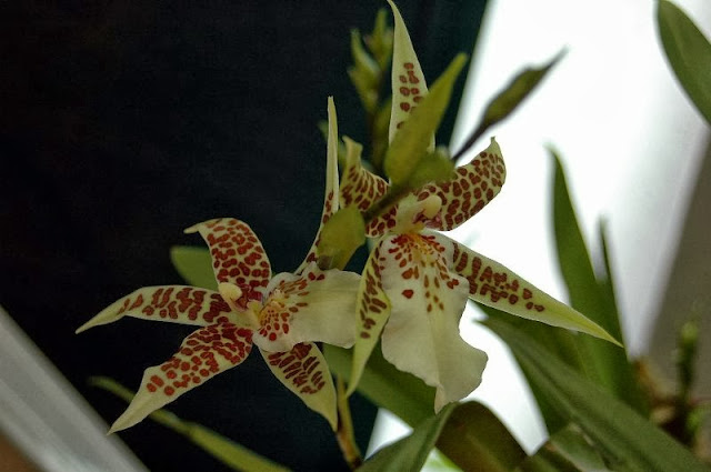 Vuylstekeara híbrida o cambria .Esta orquídea está aclimatada al lugar de la casa donde la tengo y florece puntualmente en septiembre en cuanto refresca un poco de noche,ha formado una enorme planta con los años.