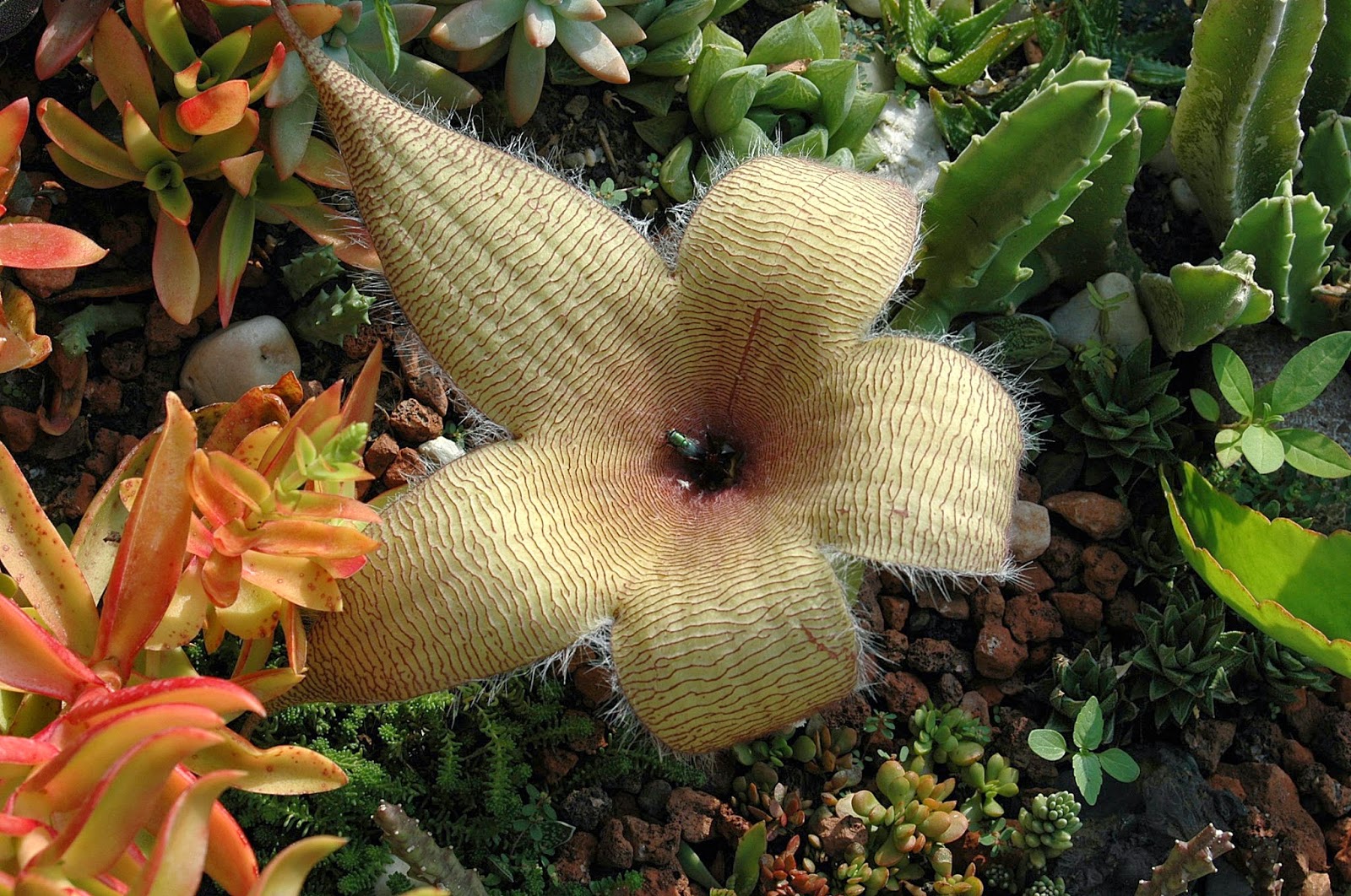 Stapelia gigantea .Este otoño ha echado muchas flores lo que implica muchas moscas que se sienten atraídas irresistiblemente por su olor fétido.