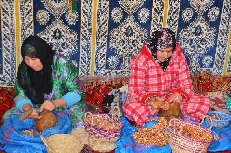 Mujeres partiendo las  cáscaras para obtener las semillas de las que se saca el aceite moliéndolas.