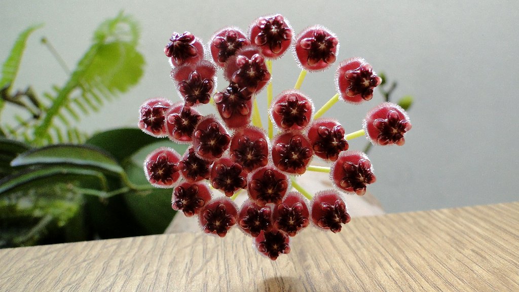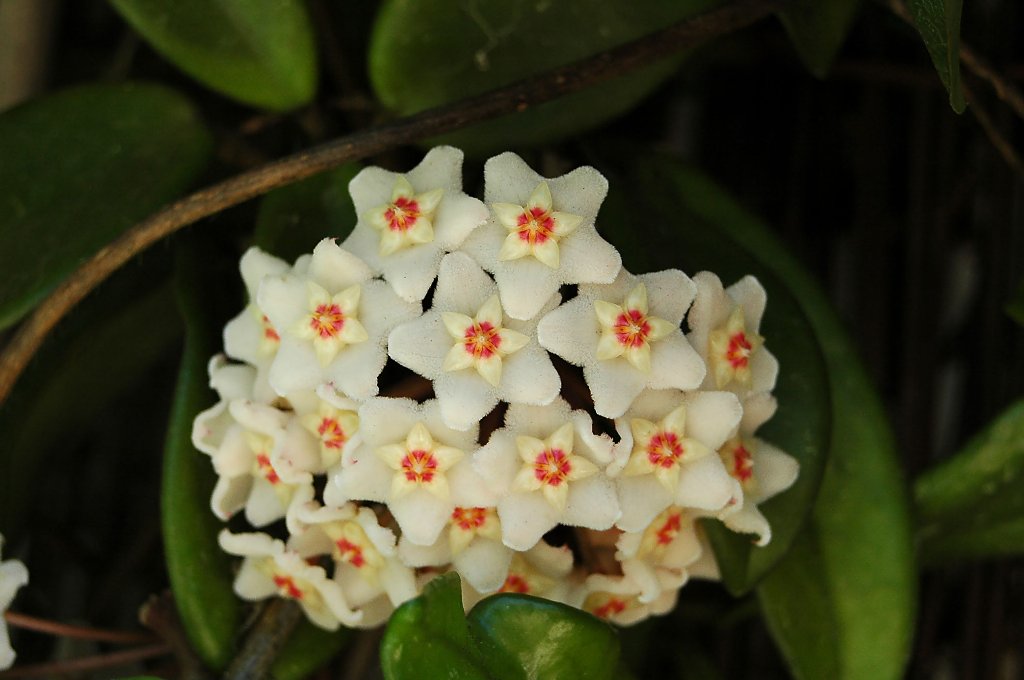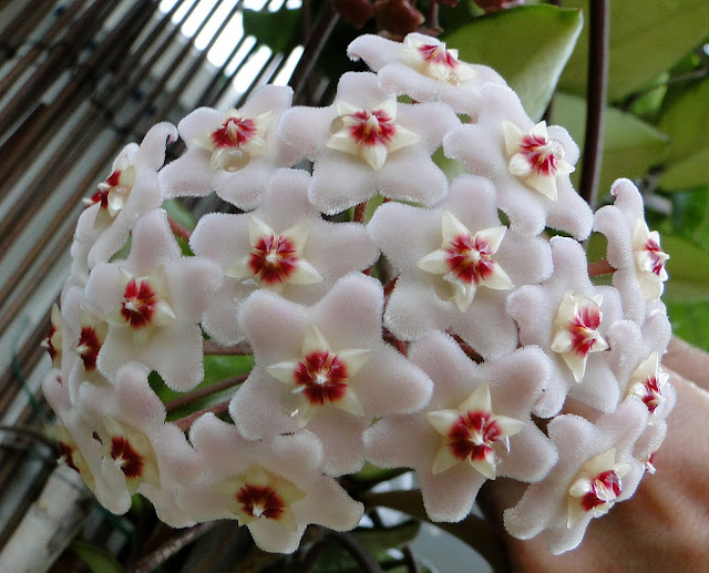 Hoya carnosa ,flor de cera .Esta trepadora de hojas carnosas es una asclepiadácea y puede llegar a alcanzar los seis metros aunque su crecimiento es lento.El género consta de una 100 especies originarias de Asia y Australia.Las flores se agrupan en forma de pseudo-paraguas. Cada flor es de color blanco, a veces con un centro rosa, y miden 1.5 a 2 cm de diámetro.
