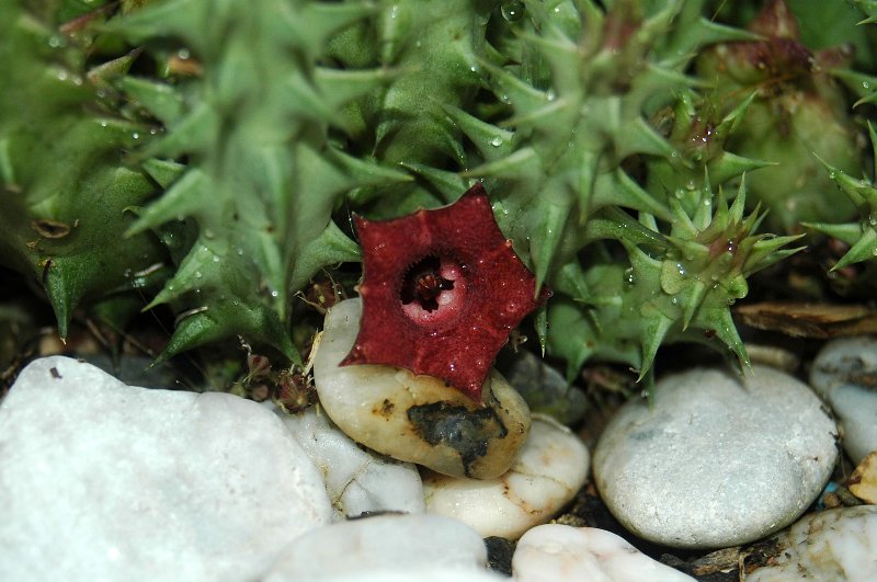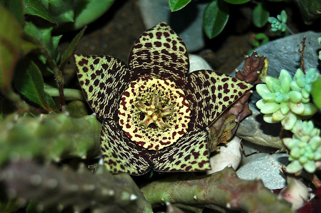 Stapelia gigantea , este género comprende mas de 50 especies de la familia de las apocináceas originarias en su mayoría del sur de África.Esta especie es de las más sorprendentes por el tamaño de sus flores que en algunos casos alcanzan 30 cm de diámetro.Sus flores como en la mayoría de especies de este género desprenden olores muy desagradables en este caso a carne podrida para atraer a las moscas que actuan de agente polinizador a falta de otros insectos en las zonas áridas donde habitan.El color y la textura recuerda también a la carne descompuesta.