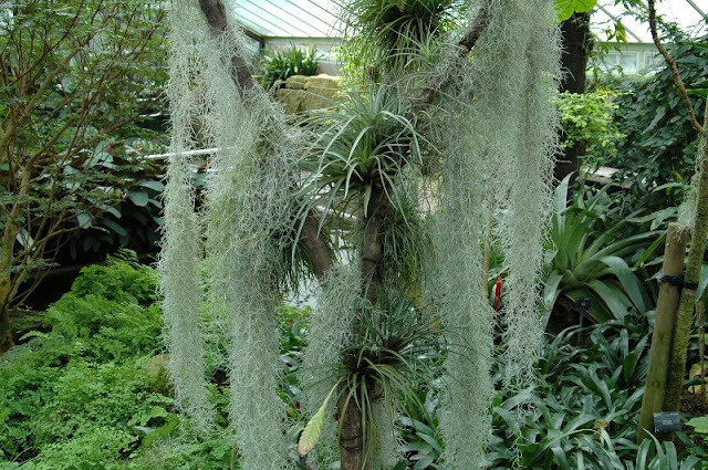 Zona húmeda con cantidad de bromelias y helechos.En primer plano tillandsia usneoides colgando de las ramas.
