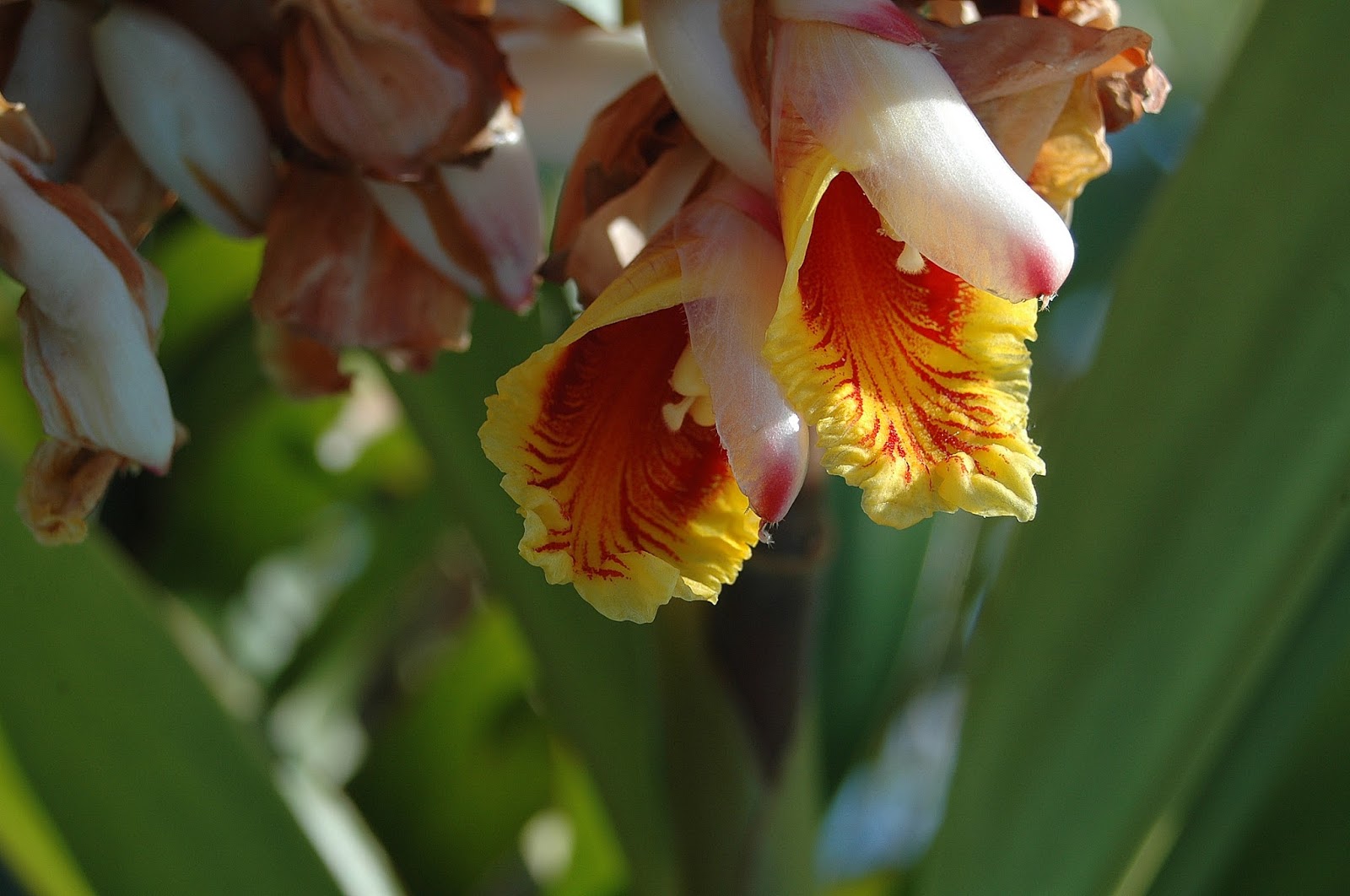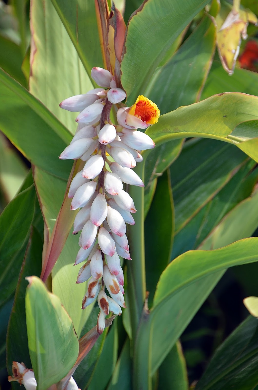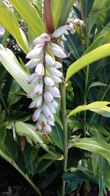 Alpinia zerumbet .La inflorescencia antes de abrir es" una escultura de porcelana perfecta" .Desgraciadamente las flores son efímeras y el sol las estropea muy prnto pero son también de una gran belleza.