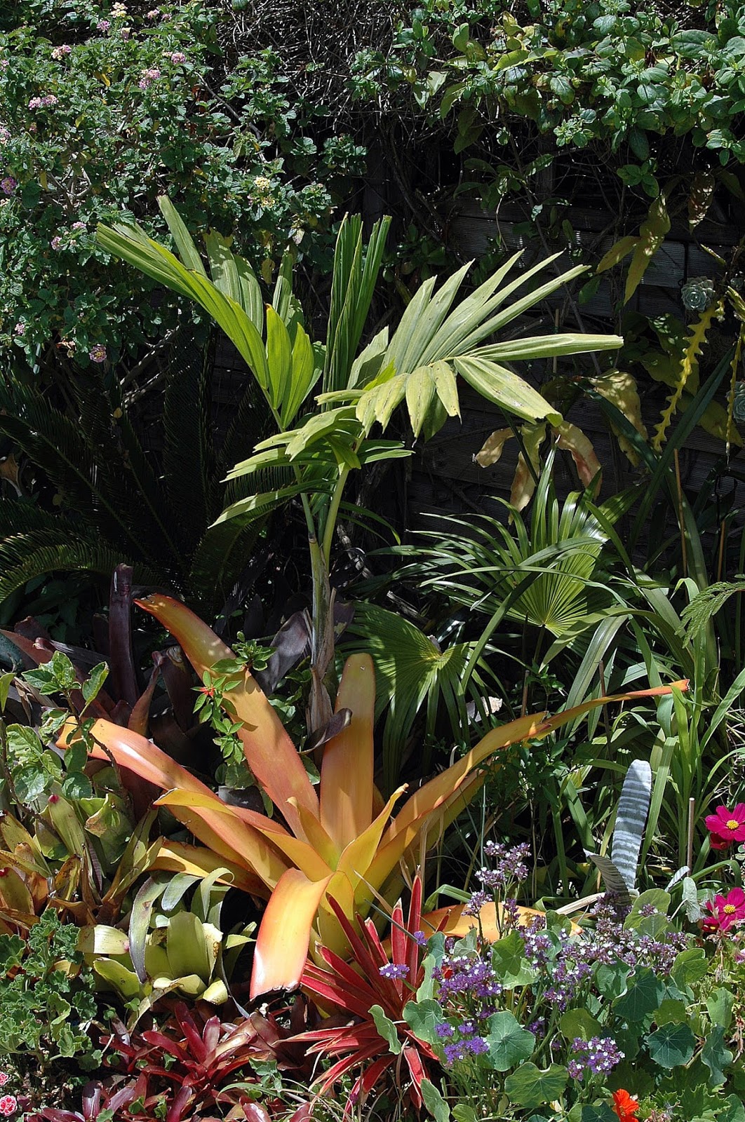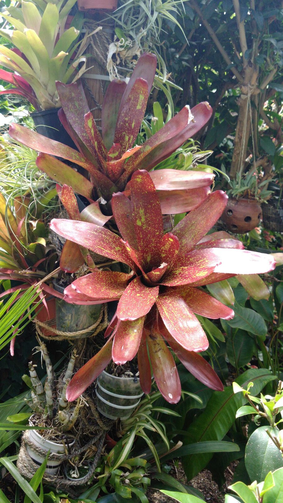Nidulariums y otras bromelias montadas en en palo clavado en tierra.Una forma de tener muchas especies en poco espacio.Al principio no está muy estético porque se ven los tiestos pero con el tiempo se cubren con masas de plantas epífitas.