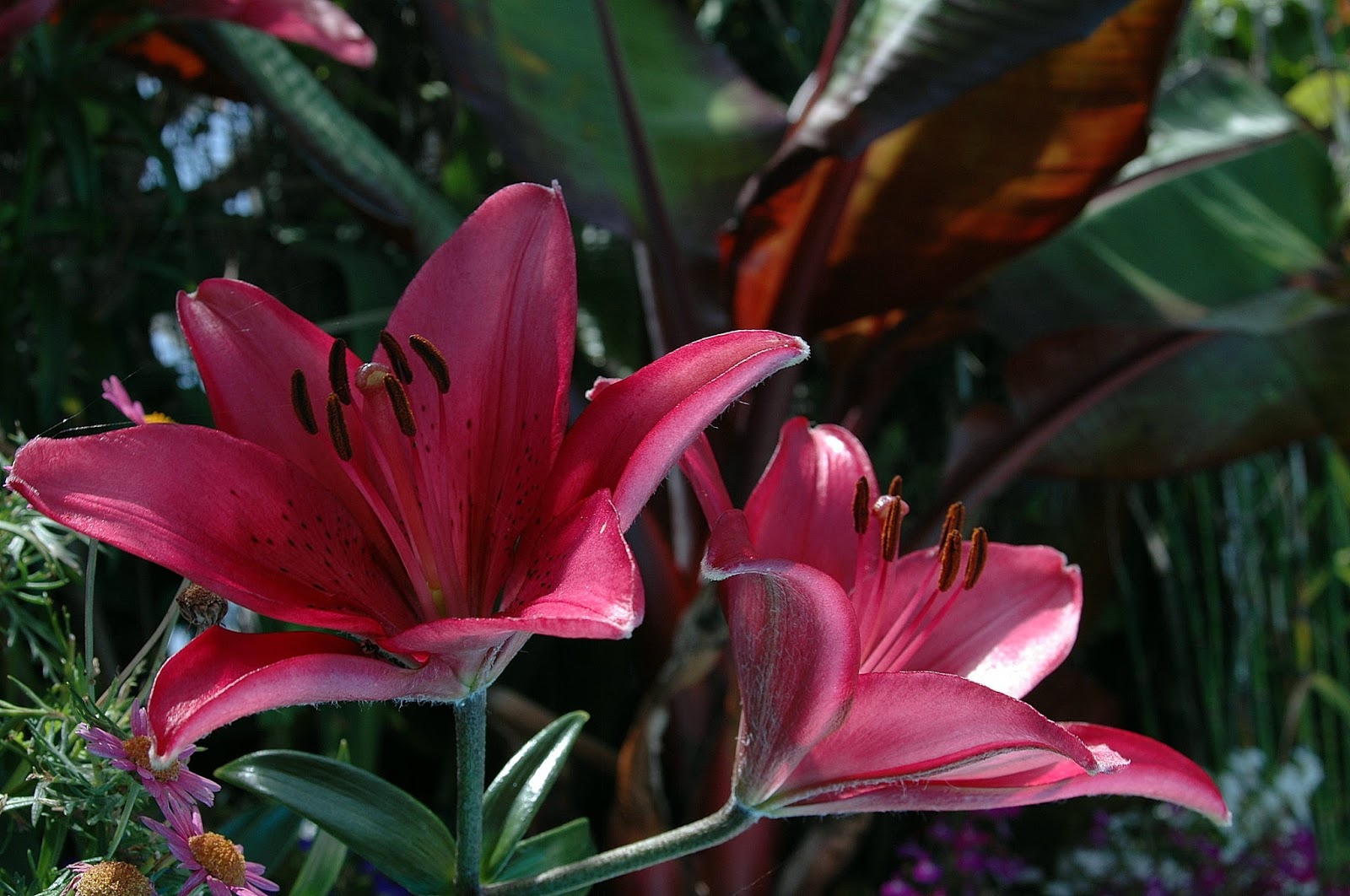 Euphorbia cotinifolia, este árbol alcanza los seis metros e incluso más, pertenece a la familia de las euphorbiáceas y es originario de Sudamérica .Aunque no está muy representado aún en la jardinería ,al menos en Málaga.Es una especie que tendría que tenerse más en cuenta por la belleza de su follaje y la facilidad de cultivo.Se reproduce tanto por semillas como por esqueje.En invierno pierde las hojas y con el exceso de sol el los meses más calurosos el rojo intenso de sus hojas se apaga un poco.