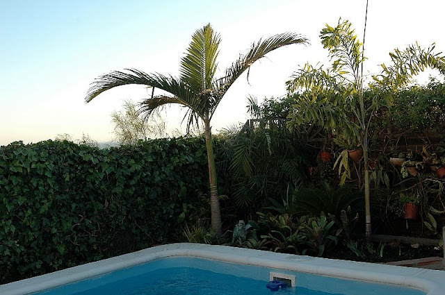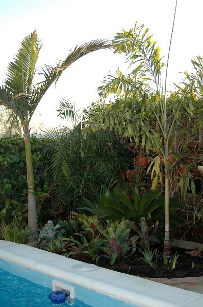 En la zona de la piscina que es la que hemos reformado ha salido un arriate donde solo estaba la palmera de la izquierda la archontophoenix alexandra .Ahora he sembrado una chamaedorea seifrizii , una Wodyetia-bifurcata ,una cyca revoluta mi colección de bromelias y mi colección de iris germanica de colores raros que están comenzando a rebrotar de los rizomas que compré en Milán.