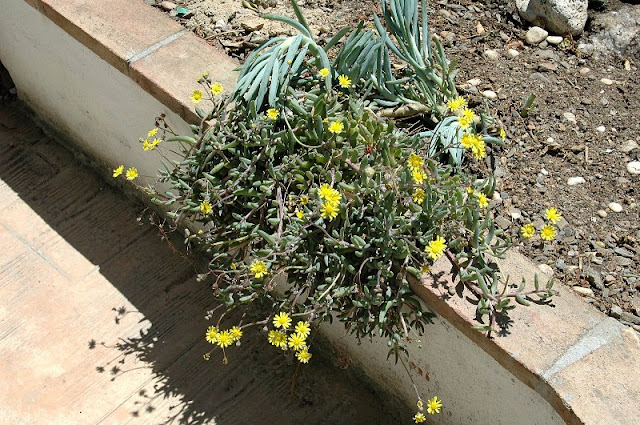 Esta othonna capensis no la he tocado porque estaba en plena floración ,solo le he cortado un poco la melena que arrastraba por el suelo y no se podía barrer bien.