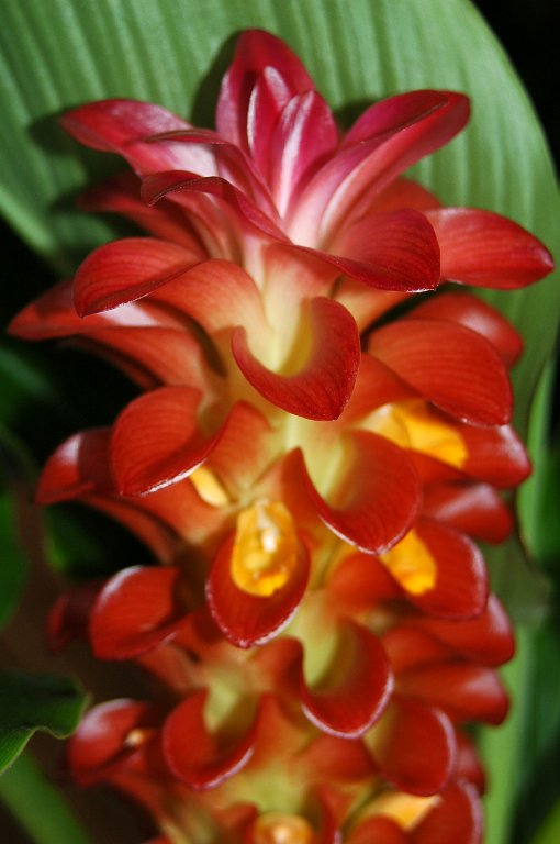 Curcuma " Red Torch" ,esta cúrcuma que compré hace muy poco está comenzando a florecer ,las pequeñas flores amarillas aparecen entre las brácteas rojas haciendo un bonito contraste.
