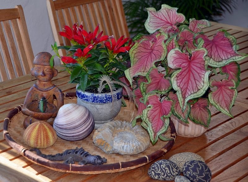 Las plantas son un Aeschynanthus lobbianus y Caladium bocolor.La escultura de un viaje a México.Un fósil de ammonites de Marruecos ,unos cantos rodados pintados por mí , un caparazón de erizo unas plumas de emú ,un escarabajo(Euchroma gigantea) ,un almeja gigante(Periglypta magnifica) y una salamanquesa de hierro forjado.