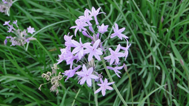 Tulbalgia violacea, esta planta, que está sembrada a lo largo de todo el parque ,es la causante de darle a todo el recorrido un fuerte olor a ajo. Es una planta herbácea perenne que en los meses más fríos puede llegar a perder todas sus hojas para de nuevo rebrotar en primavera.Tiene una floración abundante y prolongada y tiende a ocupar todo el terreno de que disponga.Yo tengo una de hojas variegadas y también las hay de flores blancas.