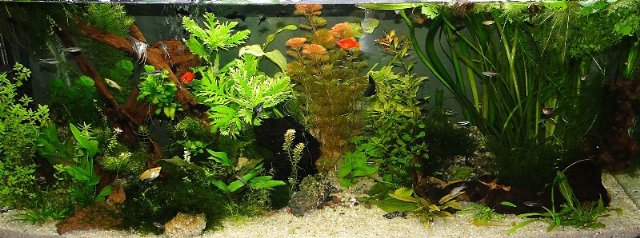 El acuario aunque lleve poco tiempo esta ya repleto de vida porque muchas plantas y peces son de otros acuarios más pequeños que tenía y de los estanquillos que tengo donde crecen muchas plantas acuáticas otras las he comprado.