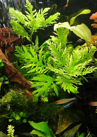 Hygrophilia difformis , originaria del subcontinente indio esta planta palustre crece como sumergida o emergida dependiendo de los niveles de agua condicionados por los monzones .El aspecto de sus hojas varía dependiendo de estas circunstancias siendo sus hojas muy divididas en cultivos sumergido y ligeramente dentadas en cultivo emergido.Crece hasta 50 cm de altura.Es necesario en acuario cortarles la yema terminal y volverla a sembrar una vez que alcanza la superficie del agua.Esto provoca que rebrote lateralmente y no se queden sus tallos desnudos de hojas con el tiempo.