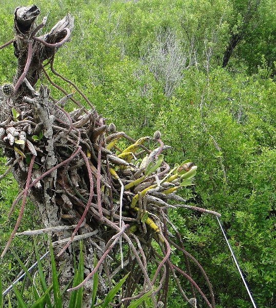 Orquídeas y selenicereus creciendo epífitas sobre la copa de un árbol, en Puerto Morelos.