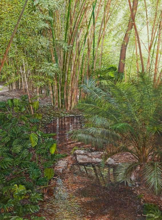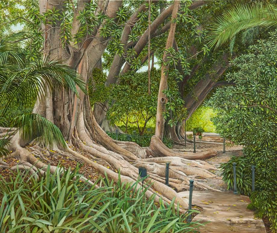 Algunos cuadros son del jardín Botánico de la Concepción de Málaga donde refleja perfectamente sus caminos de ficus,yedras y palmeras.