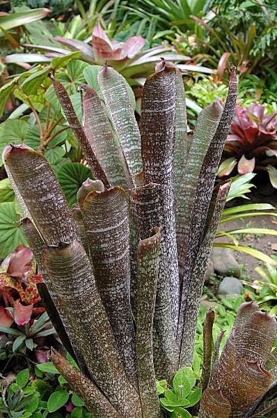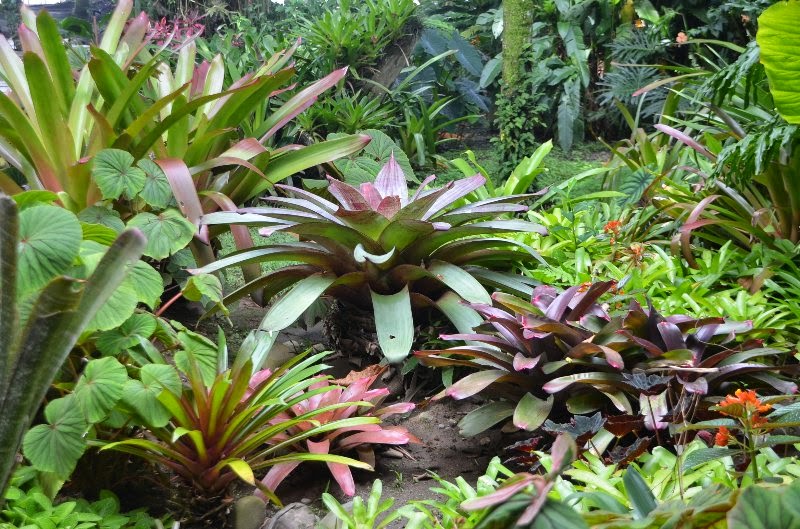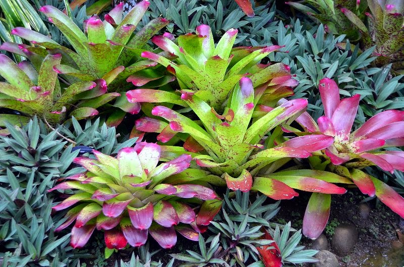 Bromelias perfectamente combinadas por colores tamaños y tanto en tierra como en troncos.Paseando por la playa se encuentran troncos arrastrados por los rios y que el mar erosiona dando como resultado auténticas esculturas naturals propias para poner bromelias y orquídeas.