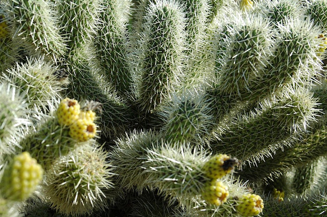 Opuntia bigelowii ,originaria de Norte América desde México a Estados Unidos.Conocida localmente como cholla ,es una planta semiarbustiva que alcanza normalmente un metro de altura. Sus numerosísimas espinas le dan un aspecto dorado y están cubiertas por una especie de vaina membranosa que se clava a cualquier objeto o ser vivo que se atreva a tocarla, siendo muy dolorosa su extracción. Se reproduce a partir de esqueje o semilla.