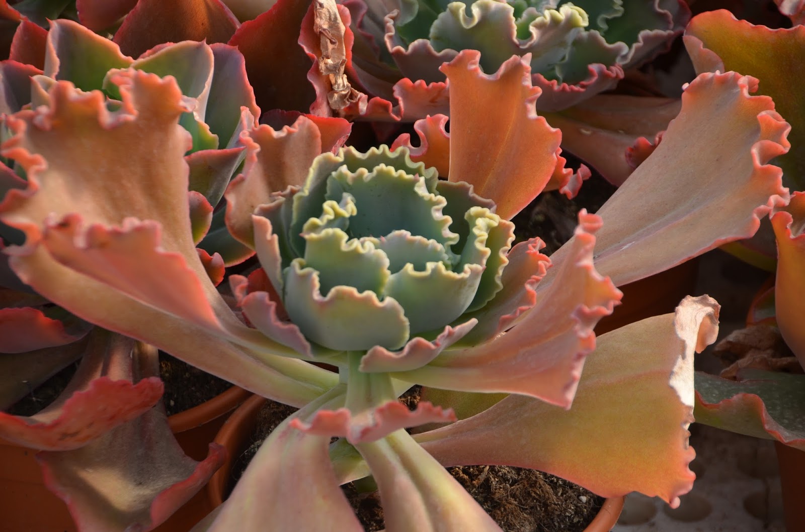 Crassula capitella cv. Campfire . Ya comienza a ponerse de un rojo intenso con los rayos de sol  ,en invierno a pesar de darle el sol esta de un verde tierno.Es curioso que no tengamos tan poca riqueza de vocabulario para designar los distintos tipos de verdes que existen por lo que nos vemos obligados a añadirles adjetivos.En cambio algunas tribus amazónicas que viven en un mundo verde tienen muchos vocablos diferentes para designar los distintos matices de verde que les rodea.