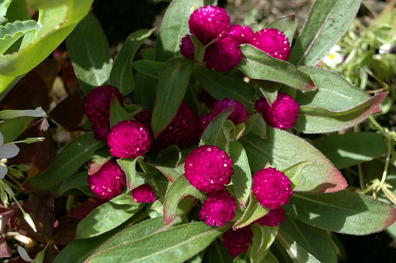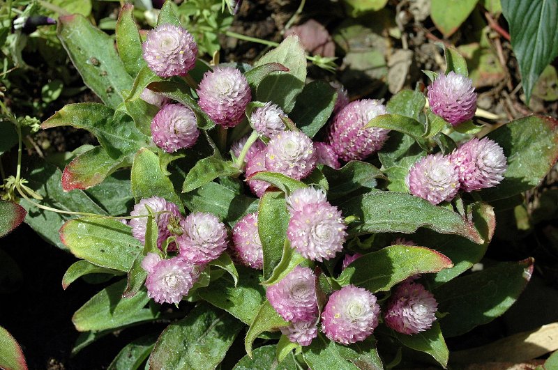 Gomphrena globosa , amaranto globoso .Esta herbácea anual pertenece a la familia de las amarantháceas .Alcanza una altura de 15-20 cm y sus flores van desde el blanco a distintos tonos de rosado.Requiere pleno sol calor y humedad.