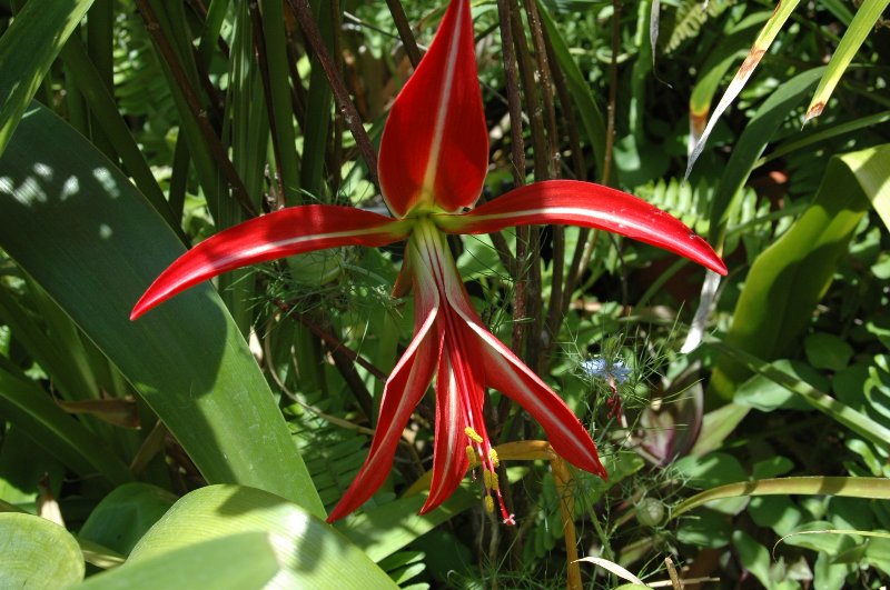 Sprekelia formosissima .Esta ha salido con una lista muy marcada de color blanco en cada pétalo.