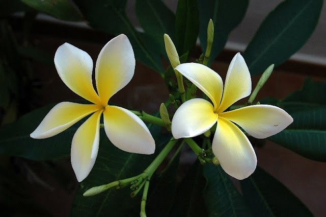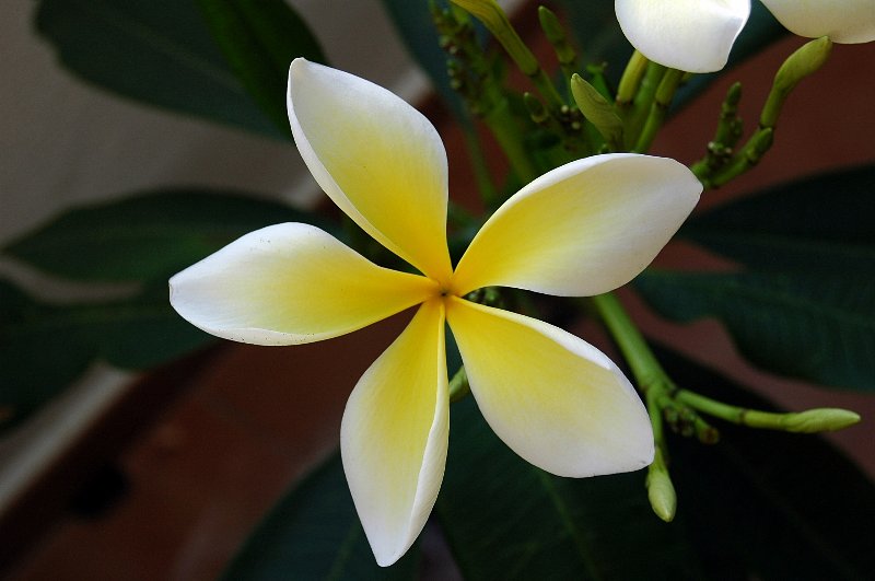 Plumeria alba hybrida ,lástima que no se pueda oler por internet el aroma delicado y a la vez penetrante de esta planta.La cabo de comprar tengo ya demasiadas pero me recordó las grandes plumarias que hay en la isla de Bali en los templos ,las ofrendas a los dioses. Allí las tiene de todos los colores.En la zona donde vivo siempre ha habido las cl´sicas blancas y rosas fuerte pero cada vez se ven más hybridos de colores espectaculares.Espero ver esta mía algún día convertida en arbolito perfumado.